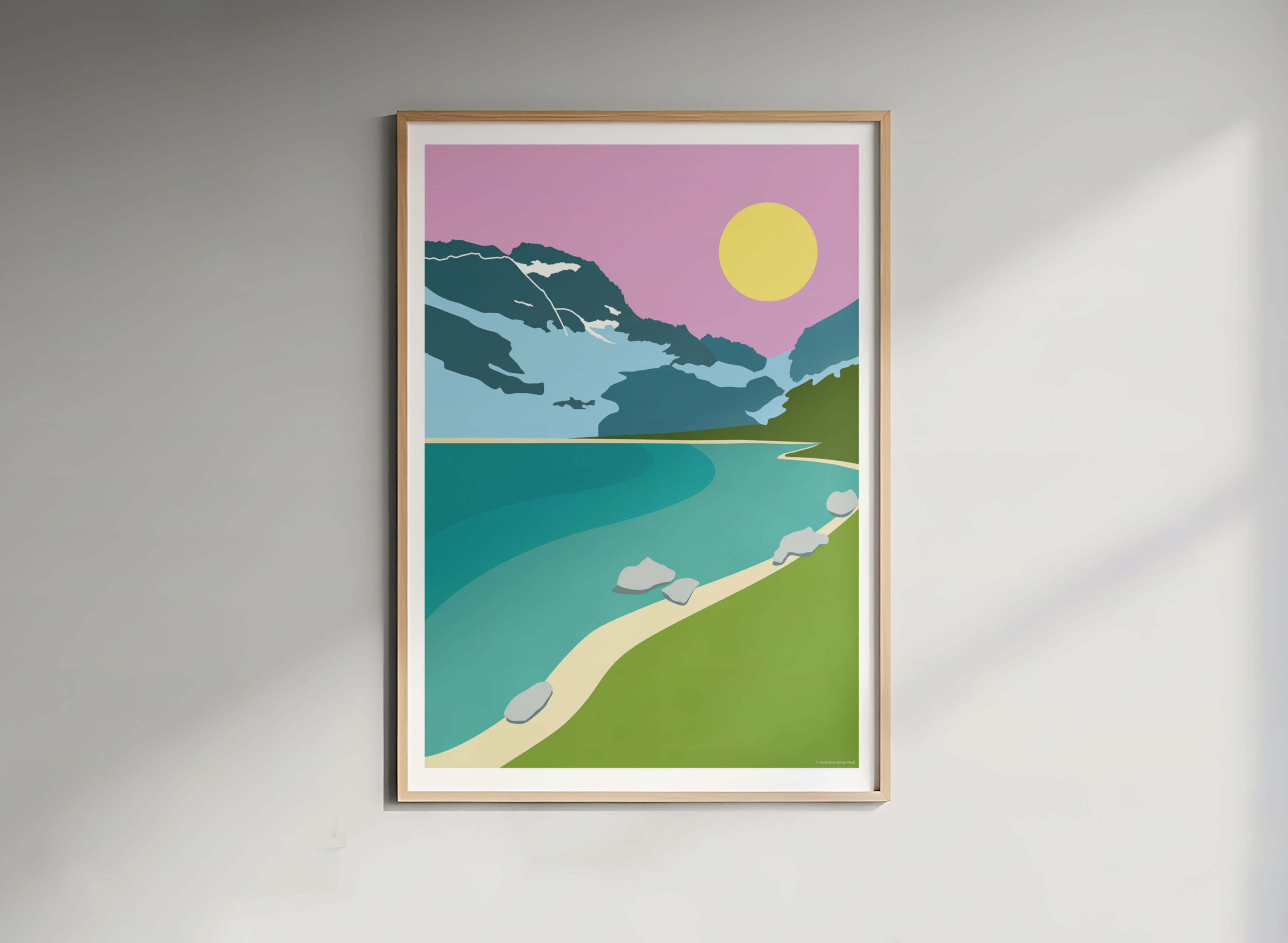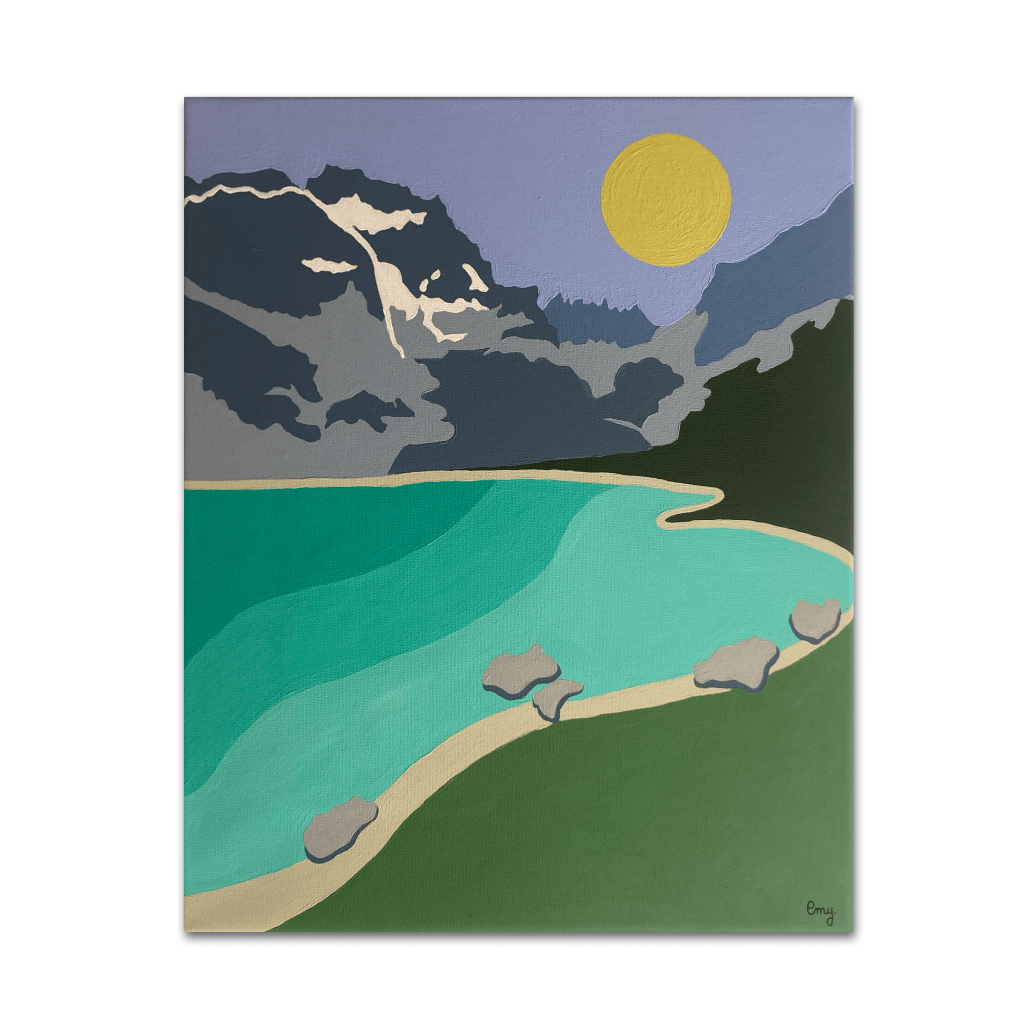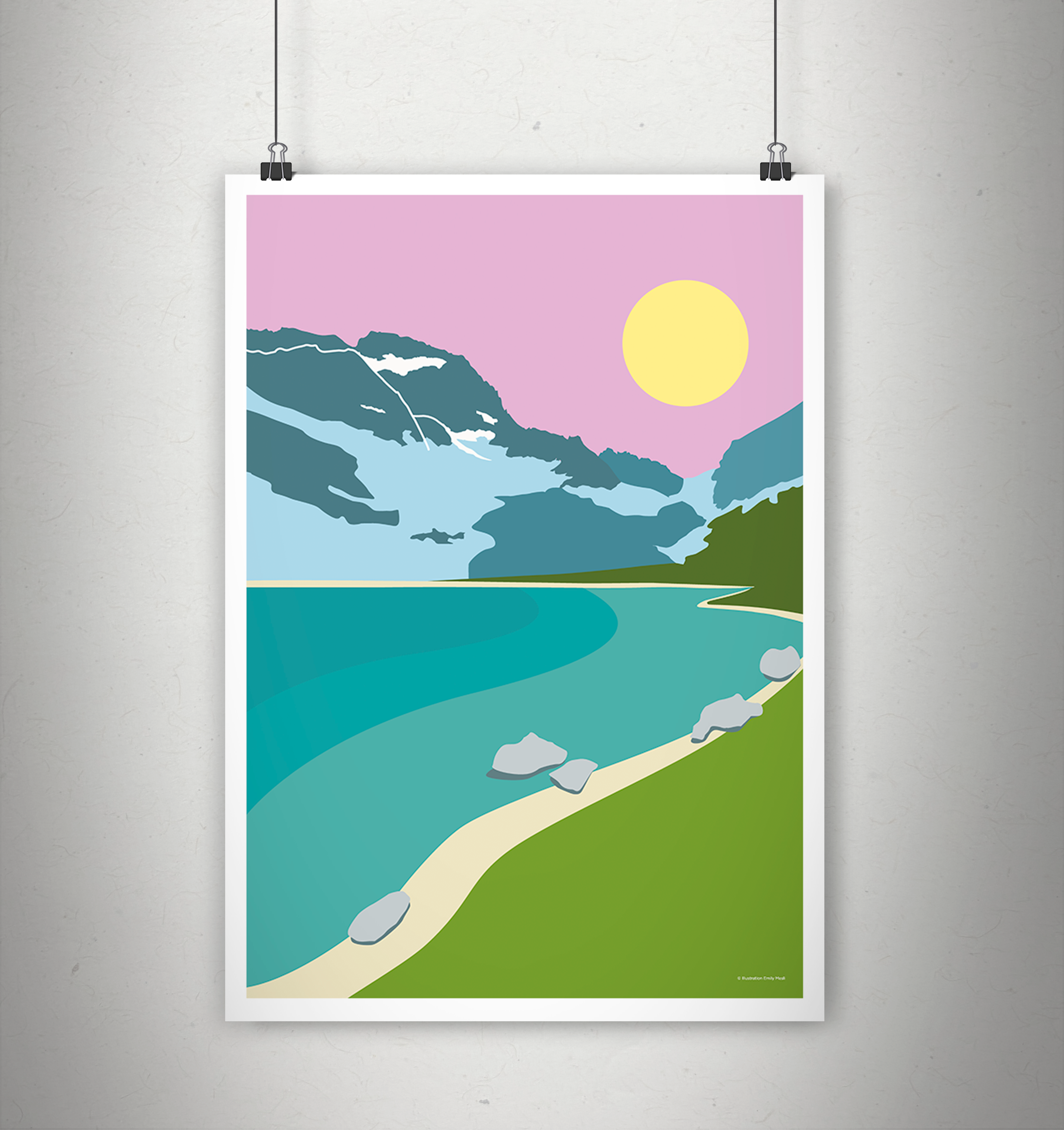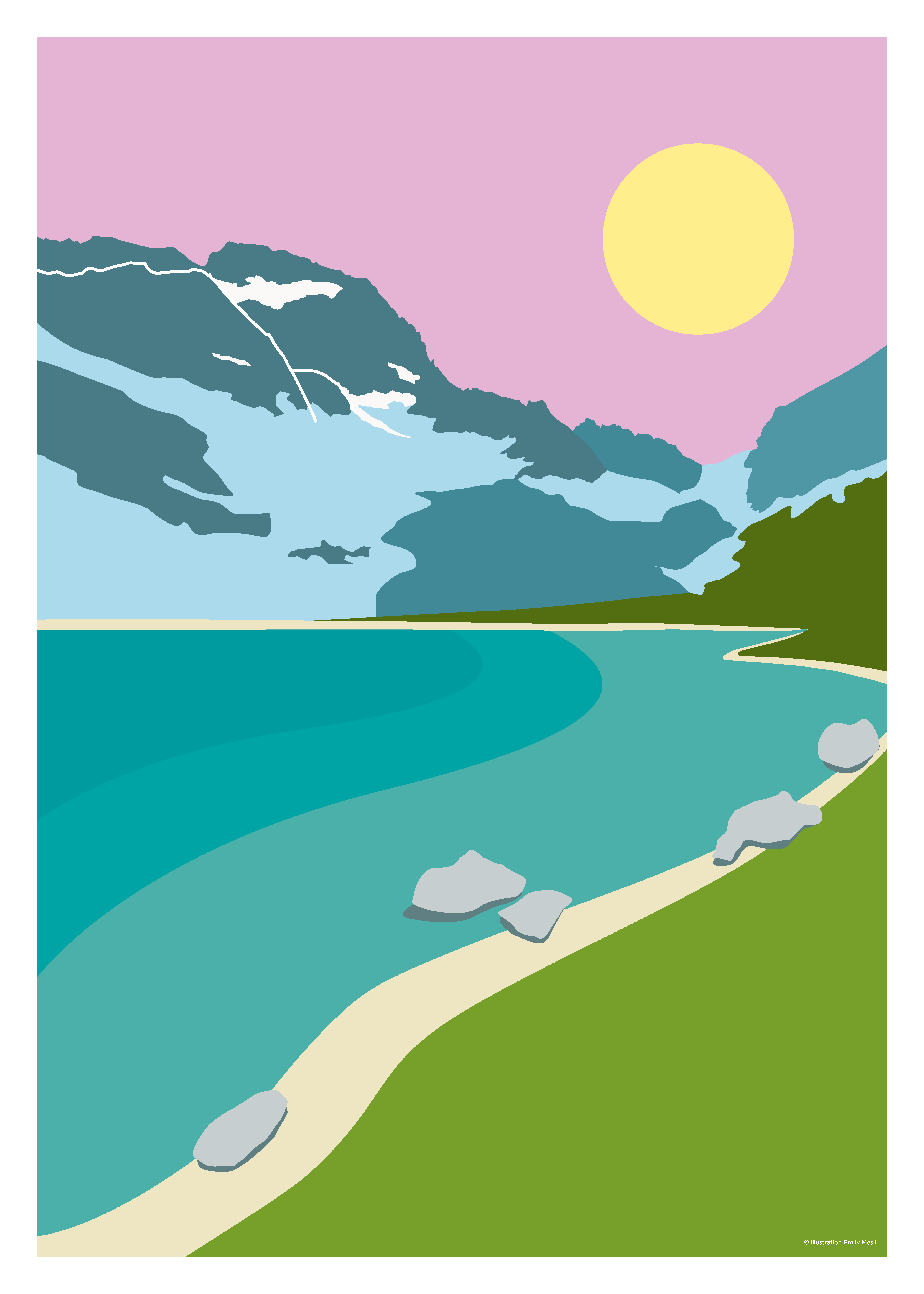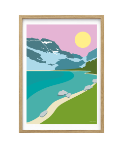 Évadez-vous au cœur du Parc national des Écrins avec cette affiche moderne du Lac de la Muzelle. Cette illustration vectorielle au style graphique minimaliste et coloré, dépeint le célèbre lac turquoise et son majestueux glacier sous un ciel rose poudré. Elle apporte une touche de fraîcheur et d’élégance à toute décoration intérieure. Parfait pour les amateurs de montagne et de design épuré.