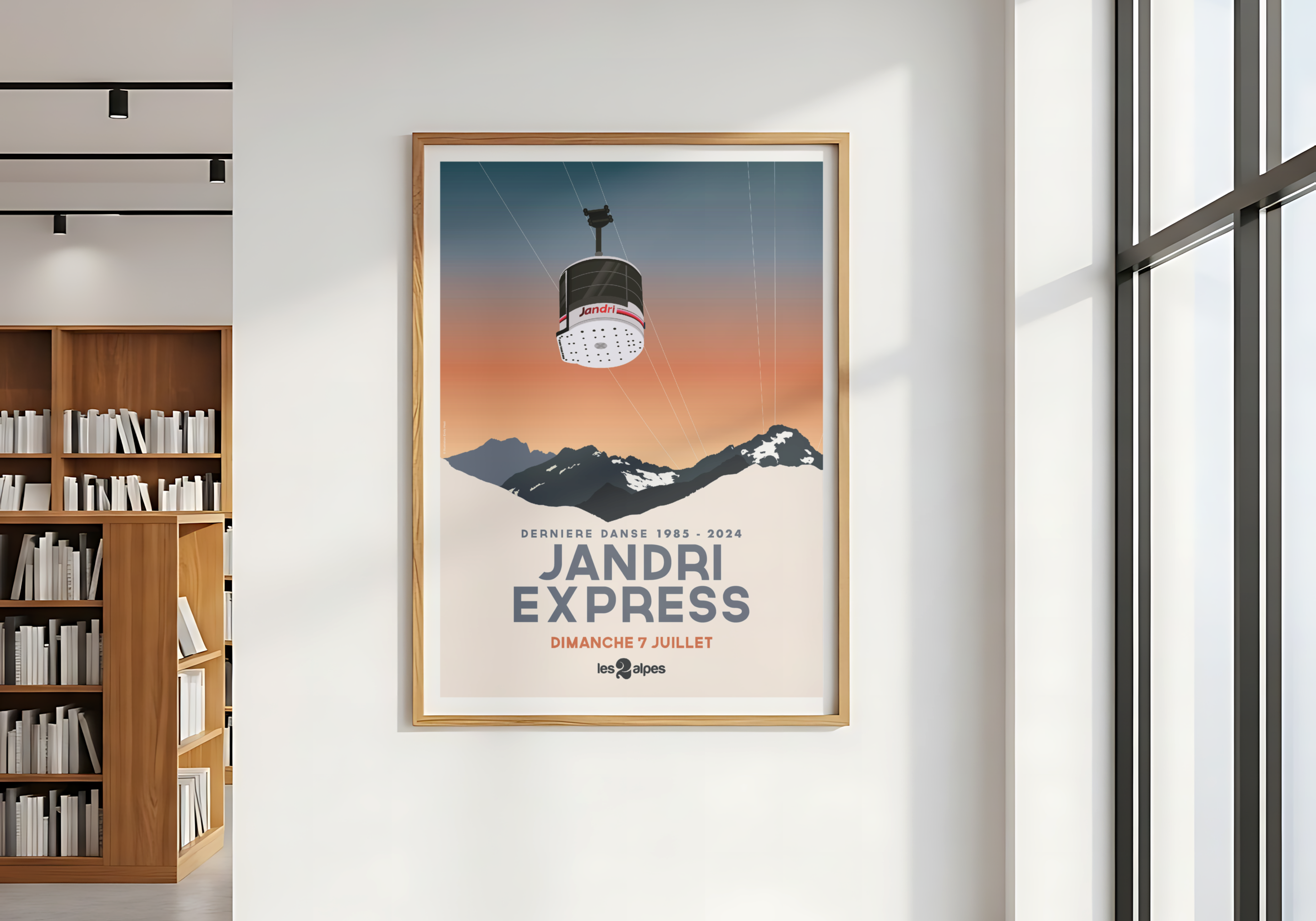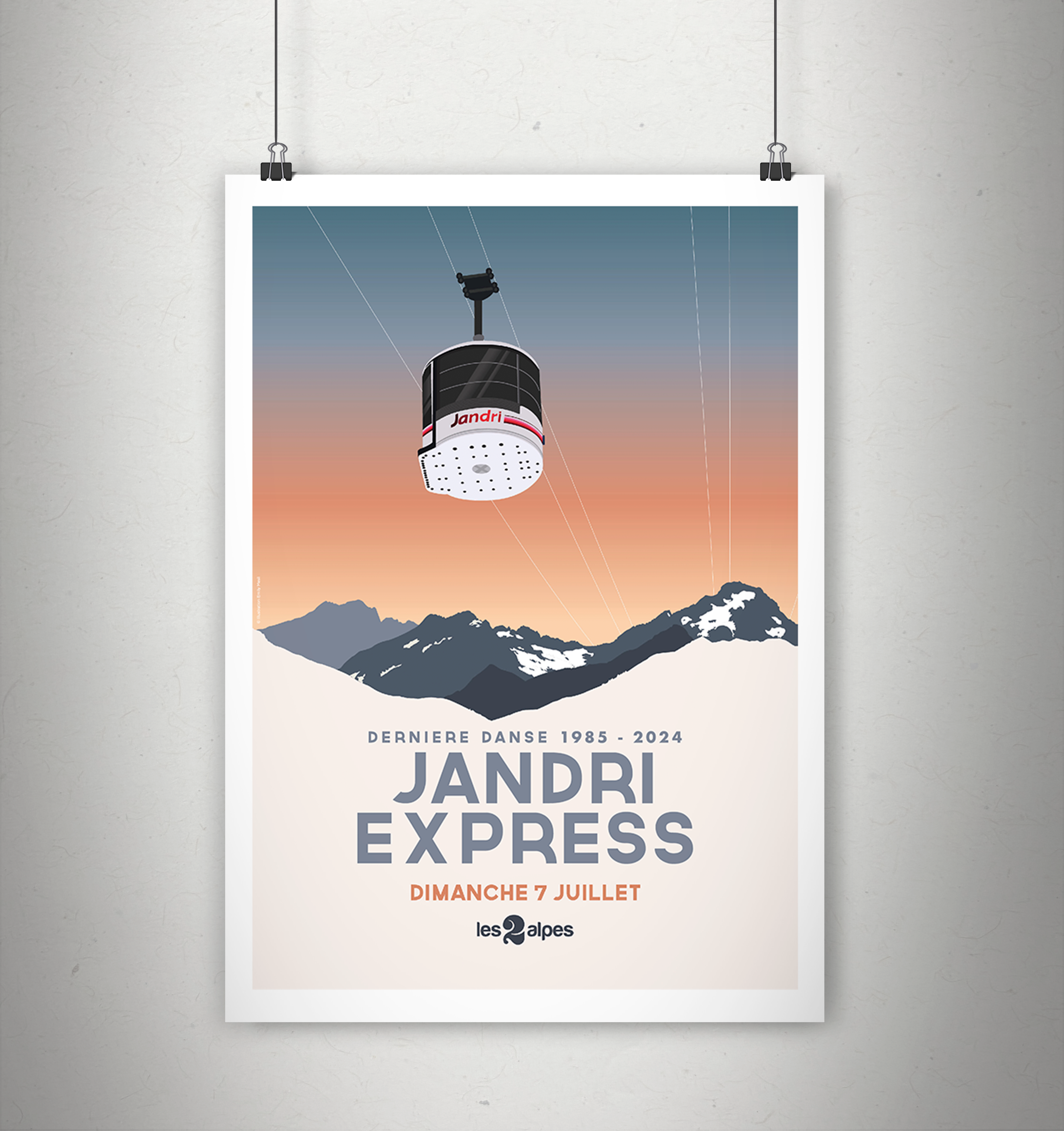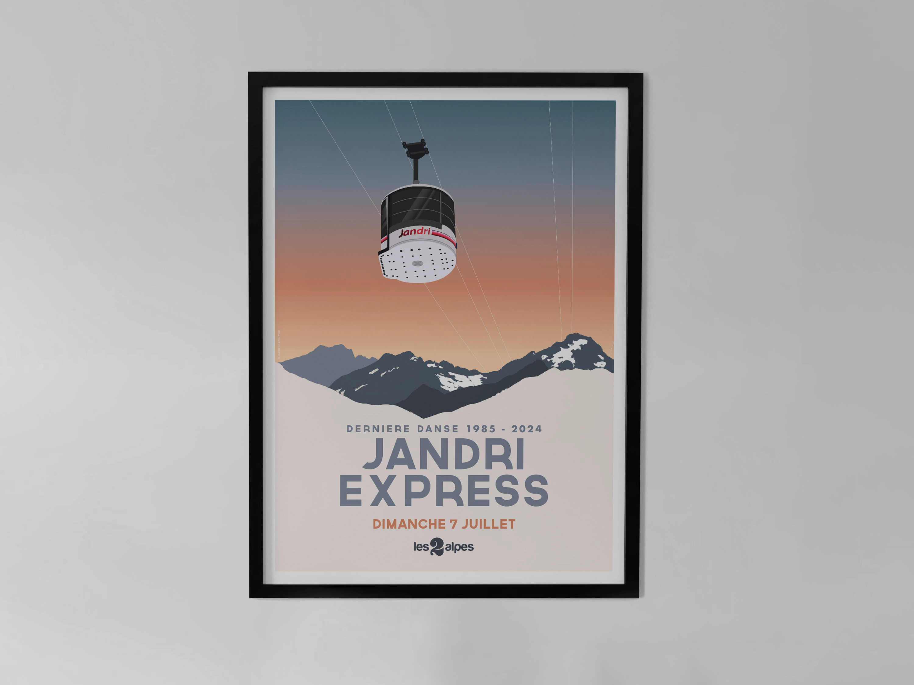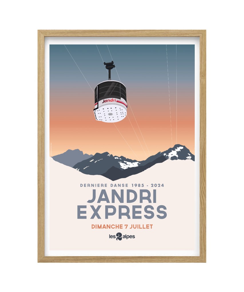Cette affiche collector célébrant la dernière journée d’exploitation de la mythique télécabine du Jandri Express. Suspendu au-dessus des sommets enneigés de la station des Deux Alpes, cette illustration réalisée pour l’occasion marque la fin d’une époque mémorable (1985-2024). Un design moderne, épuré et nostalgique, parfait pour les passionnés de montagne, les amoureux des 2 Alpes et les collectionneurs d’histoire locale.