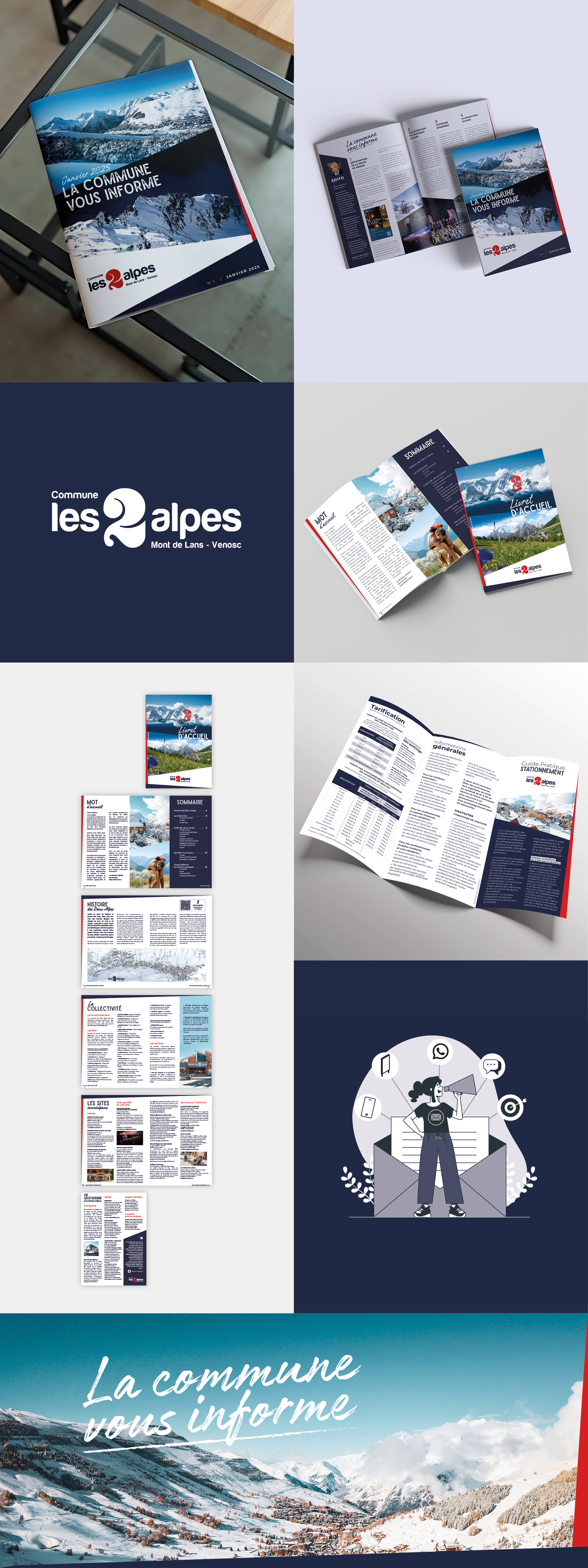 Création de différents supports de médias imprimés pour la mairie de la commune Les Deux Alpes en Isère.