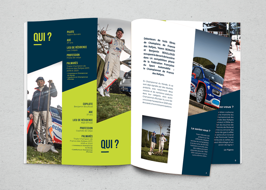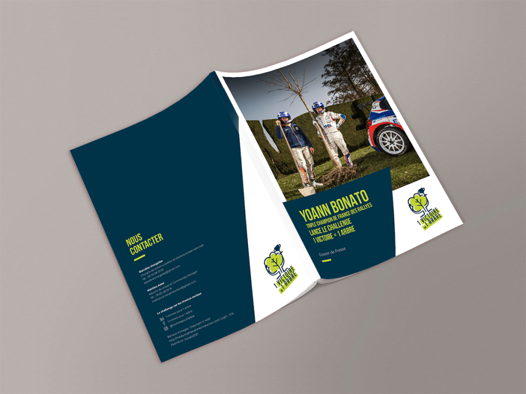 Création d’un dossier de presse 8 pages imprimé et version digital, pour l’opération »1 victoire = 1 arbre’‘ lancé par le triple champion de France des Rallyes Yoann Bonato.