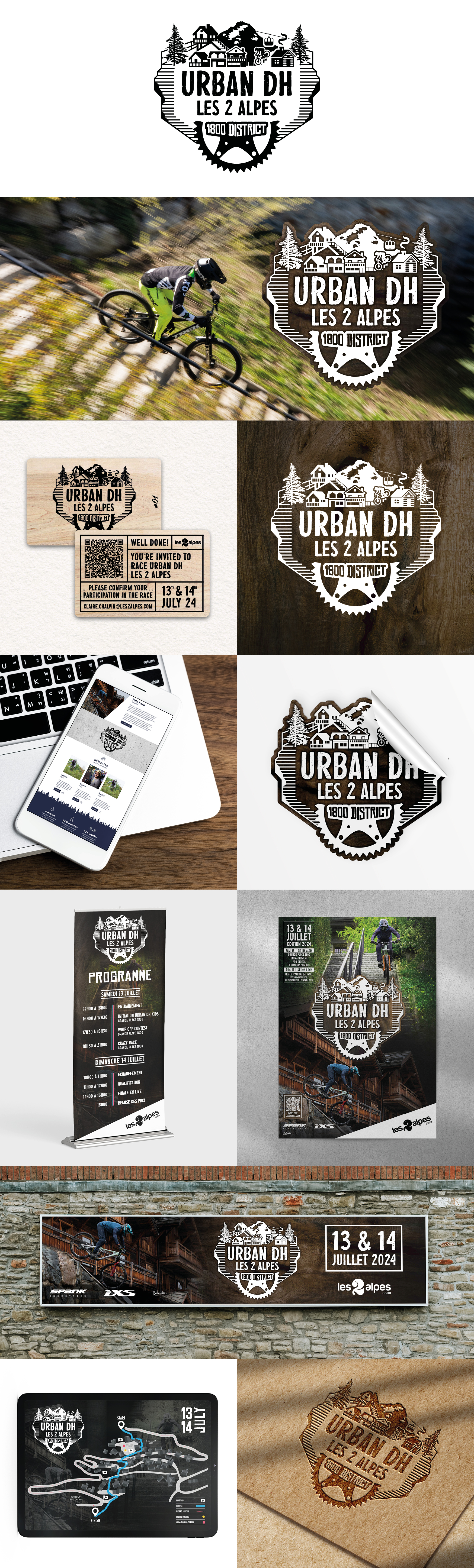 Création de l’identité visuelle de l’événement Urban DH Les 2 Alpes ainsi que tous les supports de communication imprimés et digitaux. Le concept de l’événement. Un parcours VTT chronométré réservé à l’élite mondiale créé par l’athlète de VTT DH Adrien Loron.